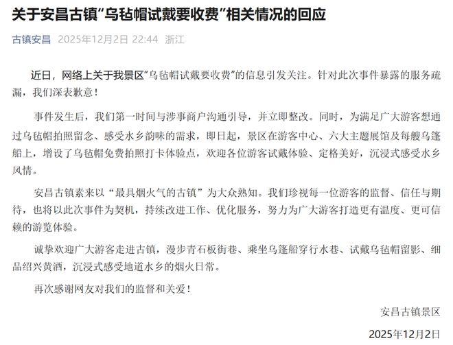 近日,网络上关于我景区“乌毡帽试戴要收费”的信息引发关注。针对此次事件暴露的服务疏漏,我们深表歉意!事件发生后,我们第一时间与涉事商户沟通引导,并立即整改。同时,为满足广大游客想通过乌毡帽拍照留念、感受水乡韵味的需求,即日起,景区在游客中心、六大主题展馆及每艘乌篷船上,增设了乌毡帽免费拍照打卡体验点,欢迎各位游客试戴体验、定格美好,沉浸式感受水乡风情。